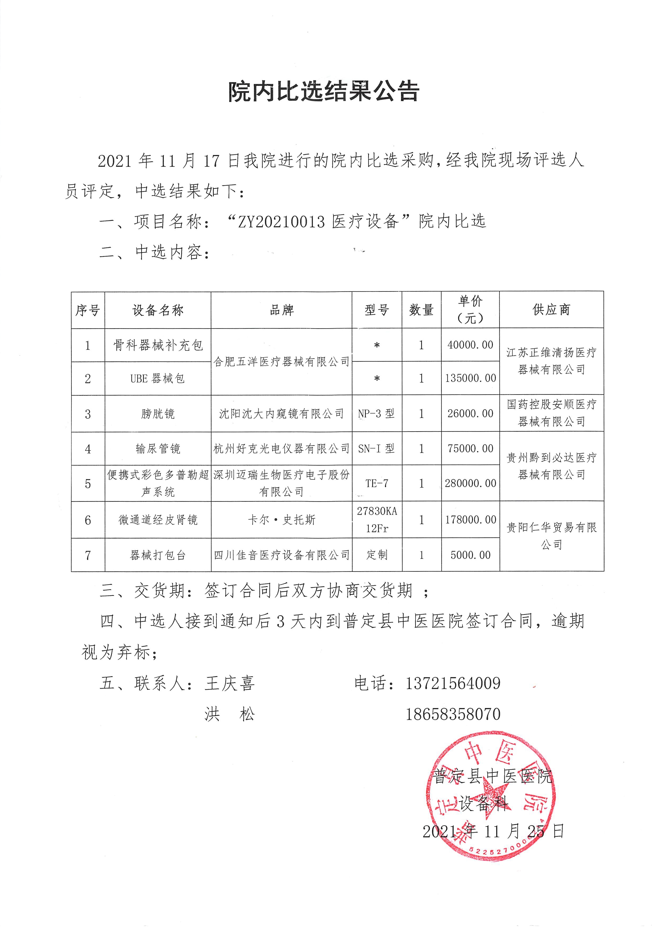 》ZY20250037-普定县中医医院院内比选结果公告 2025-10-30